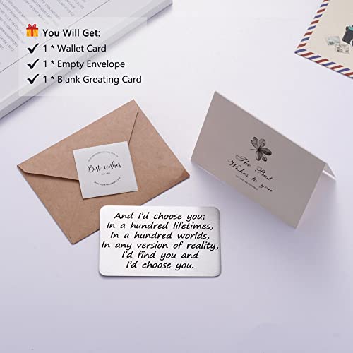 • Sweet Couple Wallet Card Gift -- Engraved with sweet words "And I'd choose you, In a hundred lifetimes, In a hundred worlds, In any version of reality, I'd find you and I'd choose you". Perfect gift for boyfriend from girlfriend, husband gift from wife, this loving note card can make him feel your love for him all the time.