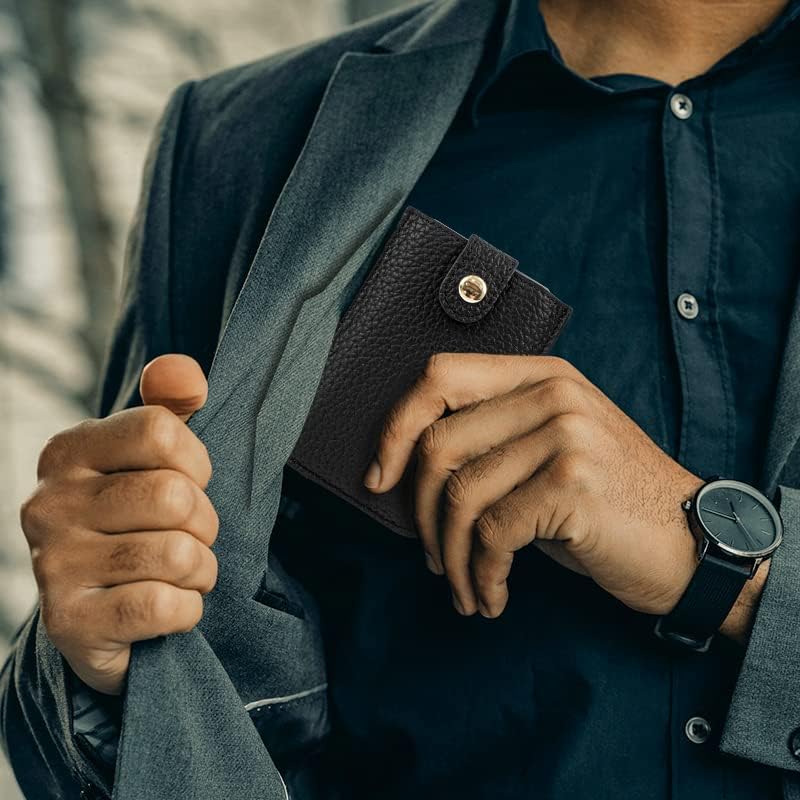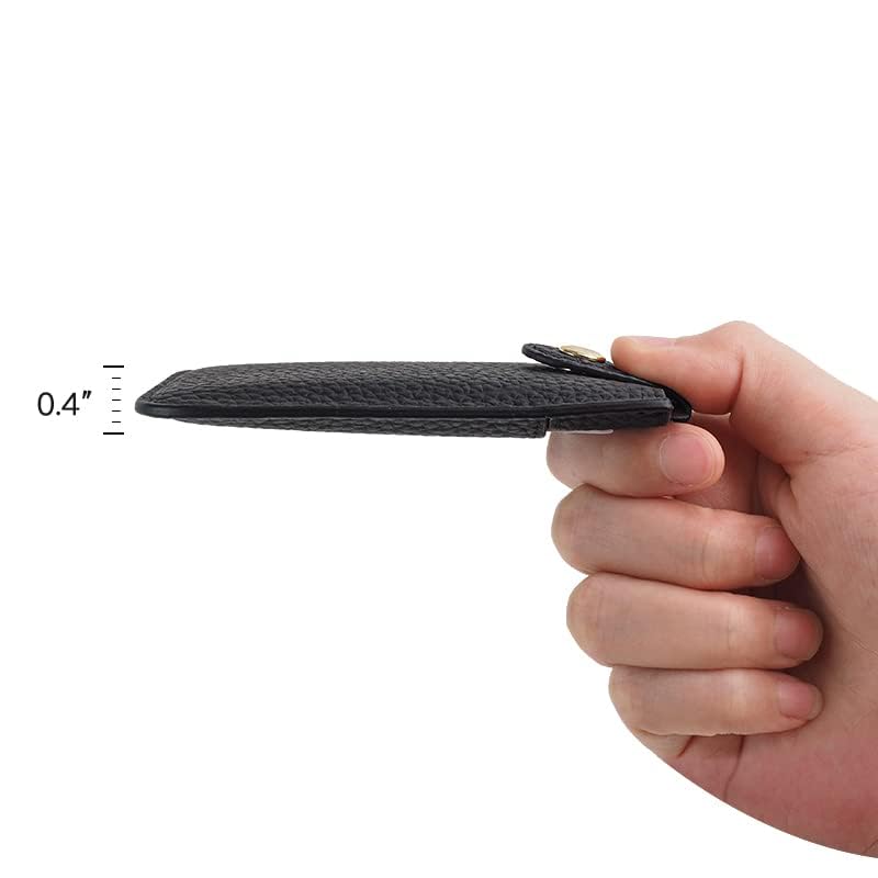 • ✨Button Closer adds security/style. Slim textured leather card holder wallet in black with brass button closer is secure stylish replacement for money clip for men & credit card holder for women