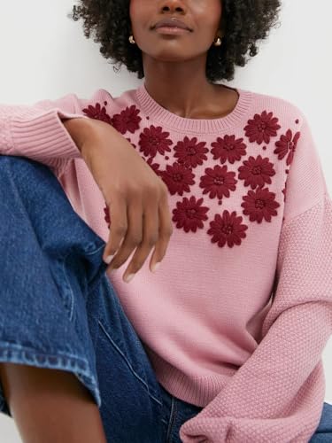 Women Embroidered Floral Sweaters Knitted Crewneck Long Sleeve Pullover Casual Loose Fall Tops 4
