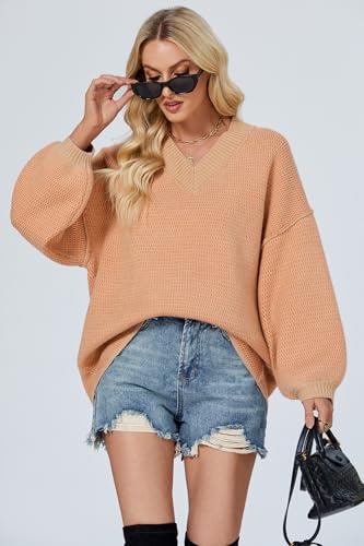 HOT ! D-Sun Women's Oversized Sweater V Neck Cable Knit Pullover Casual Elegant Ribbed Drop Shoulder Sweater Jumper