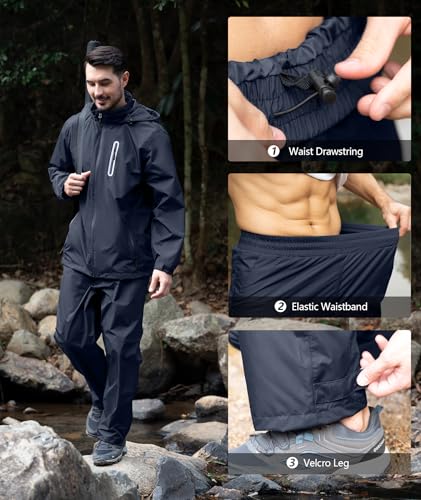 • 【5 Pockets Storge】Men rain jacket has 1 chest waterproof zipper pocket and 2 side waterproof zipper pockets to store mobile phone or wallet essentials, and the pants have 2 non-zipper pockets for additional storage space