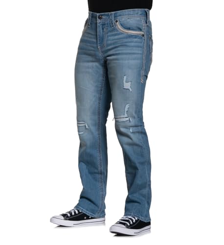 More information about Affliction Men's Distressed Denim Jeans, Light Blue Wash, Straight Leg, Decorative Back Pockets, Ripped Design