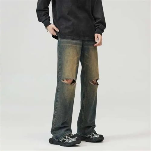 HOT ! Men's Jean Wear American Knee Hole Solid Color Full Length Loose Straight Leg Denim Pants