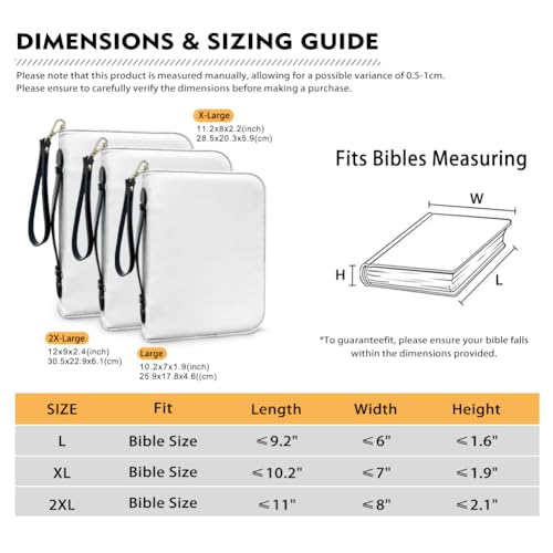 • Size: Choose from 3 sizes to ensure a perfect fit for your Bible: Large (up to 9.2" L x 6" W x 1.6" H), X-Large (up to 10.2" L x 7" W x 1.9" H), and XX-Large (up to 11" L x 8" W x 2.1" H). Please check the size chart for the best selection