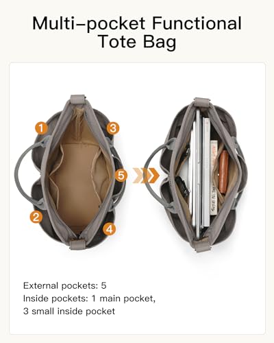 • Roomy Space -- Capacity 20L, this tote bag for women with up to 8 pockets to categorize your belongings. Main zipper compartment can easily hold A4 folders, small laptop, clothes, etc. 5 side pockets provide easy access to water bottle, umbrella, etc.