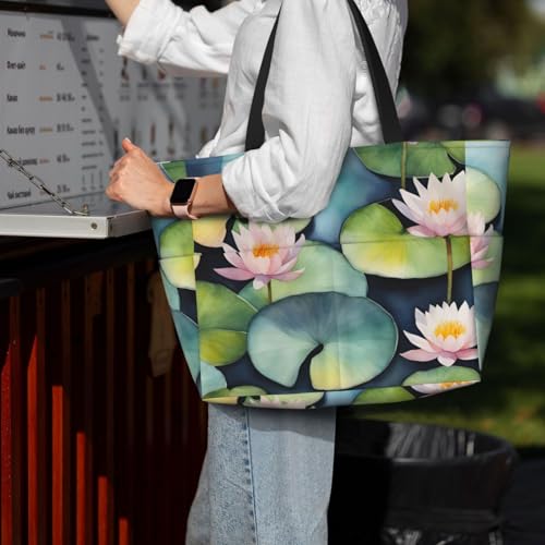 Large Capacity Beach Bag Waterproof Pool Tote for Gym Swimming Camping Carry On Bag Black Lily Pads Print 7