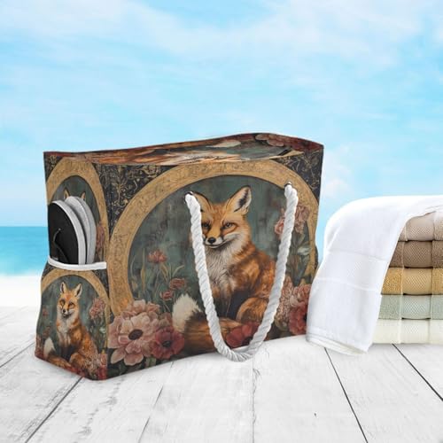 HOT ! Vintage Fox Beach Bag & Travel Tote Bag Large Sandproof with Zipper Closure, Wet Pouch for Swim Gym Travel, Lightweight Foldable Outdoor Bag