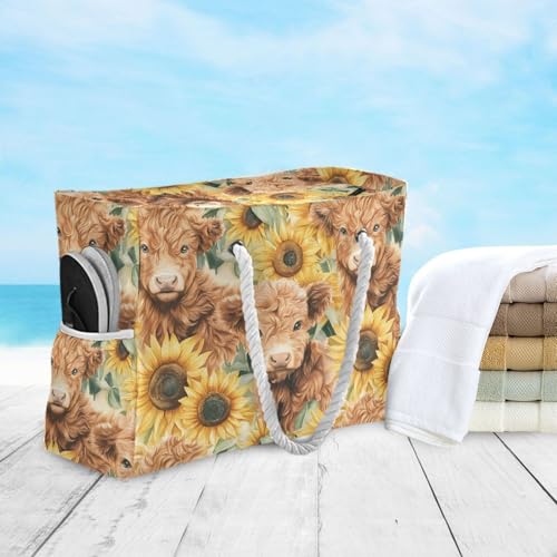 HOT ! Highland Cow and Sunflowers Beach Bag & Travel Tote Bag Large Sandproof with Zipper Closure, Wet Pouch for Swim Gym Travel, Lightweight Foldable Outdoor Bag