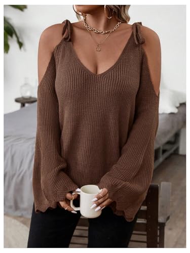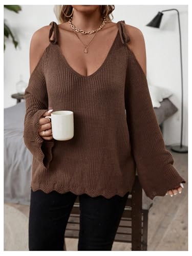 HOT ! SOLY HUX Women's Plus Size Sweaters Tie Cold Shoulder V Neck Long Sleeve Scallop Trim Knit Pullover Tops