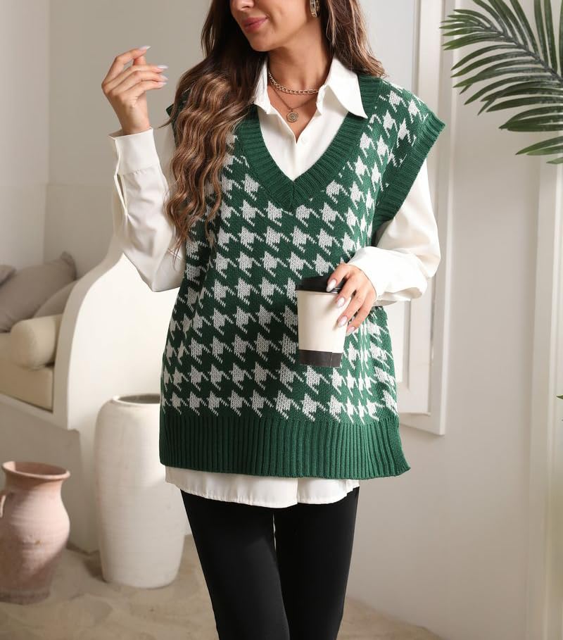 Sunfaynis Women's V Neck Houndstooth Sweater Vest Sleeveless Loose Pullover Sweater 1