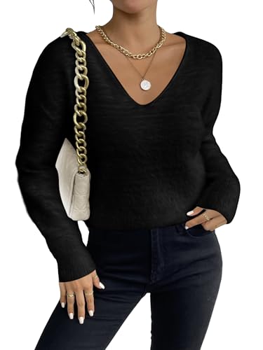 HOT ! MakeMeChic Women's Fuzzy Sweater V Neck Long Sleeve Drop Shoulder Pullover Sweater