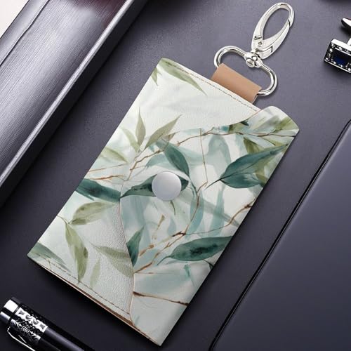 Light Green Leaves Key Holder Bag PU Leather ID Card Holder Keychains Case Cover for Men Women 6
