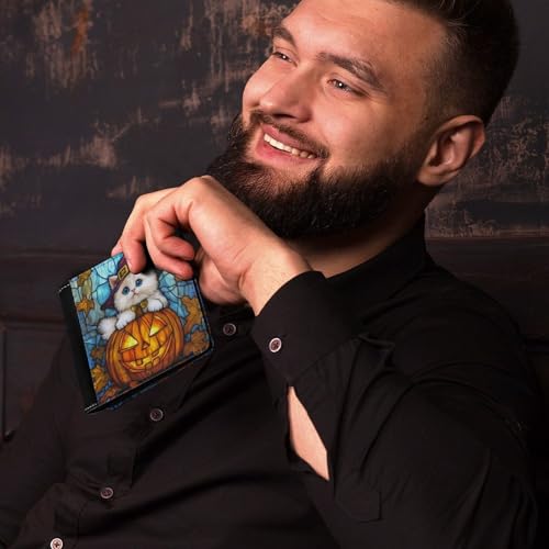 Halloween White Kitten on Carved Pumpkin Soft PU Leather Bifold Wallet, Coin Purse Credit Pass Case, Durable Card-Holder Slim Billfold for Men Woman Money Storage 1