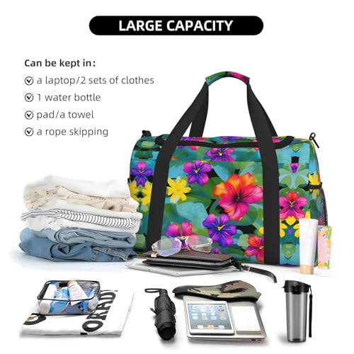 • Scene Shifter: Hawaiian Colorful Flower print Travel Bag shifts gears from being a flight-friendly travel essential to a versatile bag for weekend outings and sporting escapades. It blends functionality and style, making it suitable for various scenarios, from airport terminals to hiking trails.