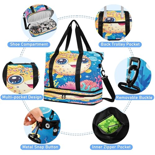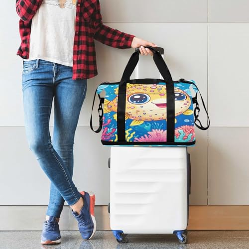 Puffer Fish Sea Blue Travel Duffel Bag for Women Men Gym Bag with Shoe Compartment Wet Pocket Carry On Weekender Overnight Bags for Airline Travel Gym 6