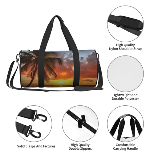 • Large Capacity: The Sunset Hawaiian Palm Tree Printed Large-Capacity Travel Bag Has A Circular Design With A Diameter Of 9 Inches And A Length Of 17.7 Inches. The Spacious Main Compartment Can Accommodate Clothing, Towels, Shoes, And Other Sports Equipment