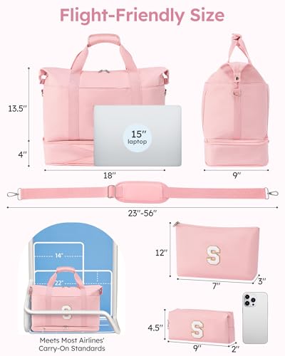 HOT ! Gifts for Granddaughter, Initial Personalized Travel Duffle with Shoe Compartment, Monogram Travel Duffel with Makeup Pouches, Girls Dance Bag, Kids Weekender Overnight Bag, Pink, Letter S