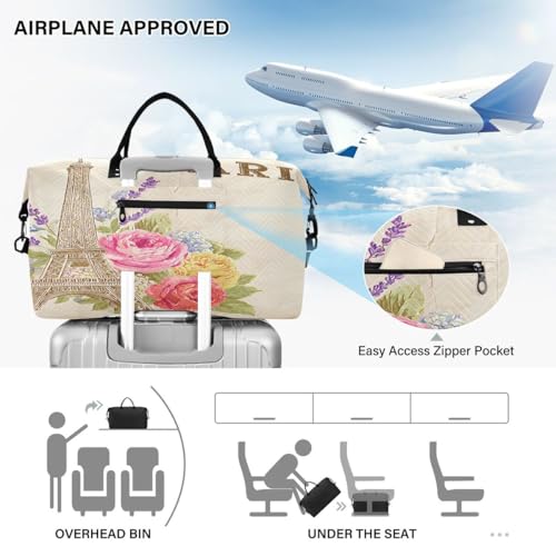 Eiffel Tower Paris France Rose Lavender Flower Travel Duffle Bag Gym Bag Weekender Bags with Toiletry Bag Travel Trip Tote Bag 6