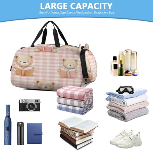 YETTASBIN Sport Travel Duffel Bag for Girls Boys, Cute Bear Large Waterproof Weekender Overnight Bag, Detachable Shoulder Strap Gym Bag with Shoe Compartment & Wet Pocket 1