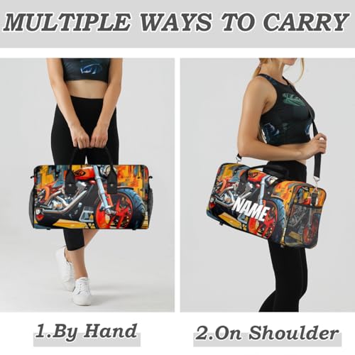HOT ! Personalized Colorful Motorcycle Travel Duffel Bag with Name, Custom Gym Sport Bag Modern Art Carry On Weekend Overnight Duffel Bag for Men Women