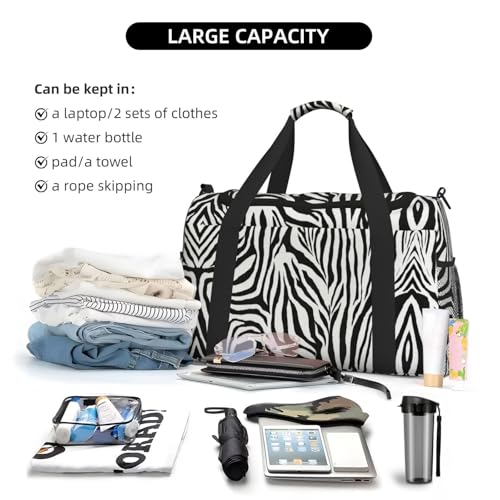 • Pocket Layout: Zebra Print print Travel Duffle Bag has one main pocket with double-headed zippers for easy access. An internal zip pocket, adjustable strap (70 - 120cm), 65cm handles, side mesh and reinforced webbing with buckle, offering organized storage.
