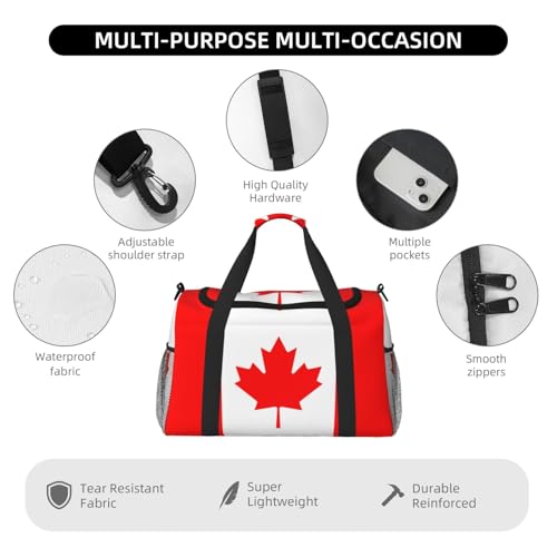 • Activity Accommodator: Canadian flag print Gym Bag not only houses gym gear but also effortlessly accommodates essentials for weekend retreats and intense outdoor activities like hunting. Its flexible design makes it a staple for fitness enthusiasts and adventure seekers alike.