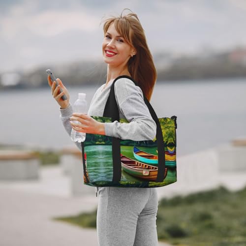 Lake with Boats Canoes Park print Gym Bag for Women,Carry on Weekender Overnight Duffle Bag,Personal Item Tote Bag 1