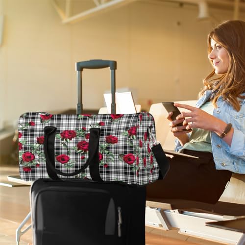 HOT ! Rose Flower Plaid Travel Duffel Bag, Buffalo Plaid Sports Tote Gym Bag, Foldable Weekender Overnight Bag, Luggage Handle Bag for Women Men