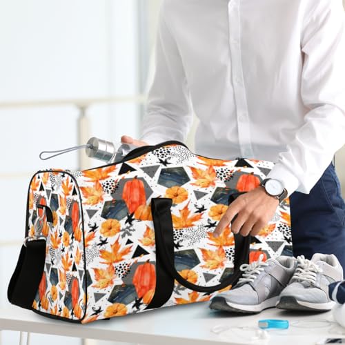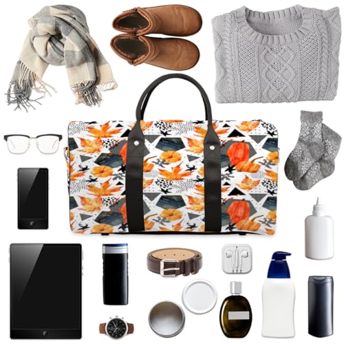 HOT ! Autumn Pumpkin Leaves Travel Duffel Bag, Halloween Geometric Sports Tote Gym Bag, Foldable Weekender Overnight Bag, Luggage Handle Bag for Women Men