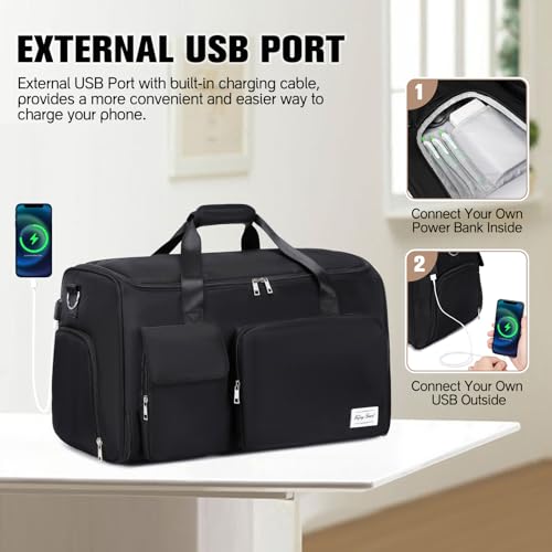 • 【Spacious Design & USB Port Design】The hanging garment bag measures 20" x 12.2" x 13.1" when packed and unfolds to 20.2" x 44.1", providing ample space for long gowns or evening dresses. The compact size meets airline carry-on requirements, fitting easily in overhead bins or under seats. Outside with USB Charging Port, and inside with Power Bank Pocket, you can easily to charge your phone while walking. (POWER BANK IS NOT INCLUDED).