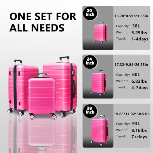 HOT ! VANELC 3 Piece Hard Shell Luggage sets with TSA Lock Spinner Wheel ABS Lightweights Checked Convenient Stackable Suitcase Woman Men (20/24/28) (Rose Red, 3PCS)