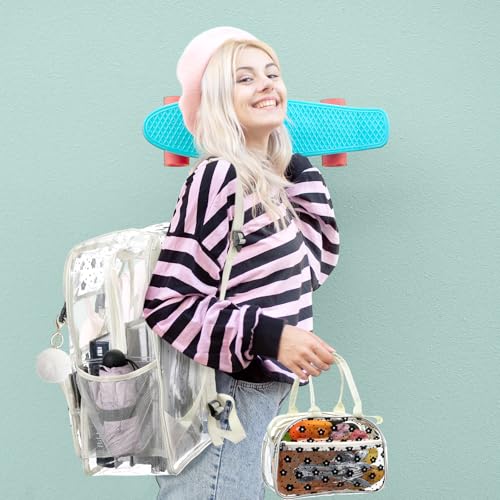 • Clear Backpack: this stylish set includes a transparent backpack, a lunch bag, a pencil bag, and a cute plush ball pendant for ample storage; The striking black floral pattern, soft beige trim, and fashion flap design create a charming aesthetic that easily pairs with any outfit, ideal for elevating your daily style