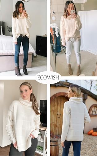 HOT ! ECOWISH Women Fall Pullover Sweater Turtleneck Plaid Long Sleeve Loose Casual Chunky Checked Knit Winter Sweaters Jumper Tops