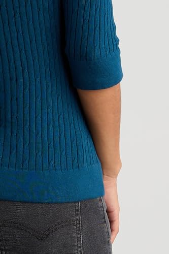 • Delicate cables give it understated elegance, while 3/4 sleeves let it span seasons effortlessly. Gently shaped fit. 25.5 inch length (size Medium)