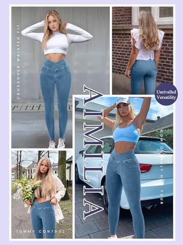 More information about AIMILIA Crossover Jeggings for Women Tummy Control High Waist Pull On Stretchy Jeans Denim Leggings with Pockets Slimming