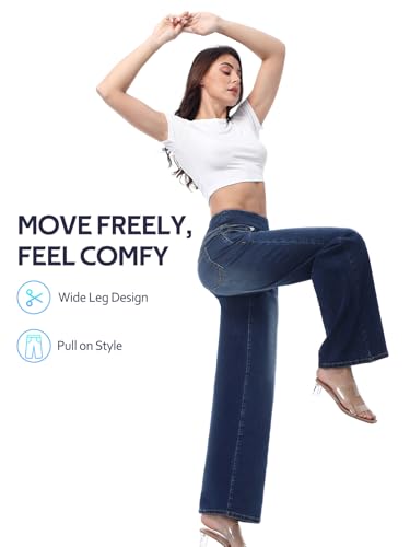 HOT ! Pull on Wide Leg Jeans for Women, High Waisted Stretchy Baggy Trendy Tummy Control Straight Leg Jeans Denim Pants