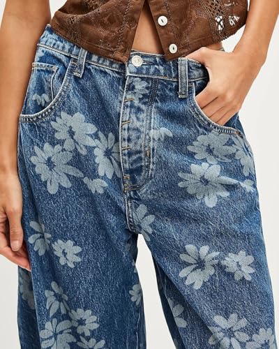 More information about Women Barrel Jeans Casual Wide Leg Baggy Daisy Printed Pants Y2k Boyfriend Mid Rise Denim Ankle Pants