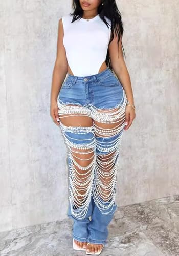 More information about LETSVDO Women's Sexy Ripped Jeans High Waist Distressed Rhinestone Pearl Chains Stretch Denim Pants Clubwear