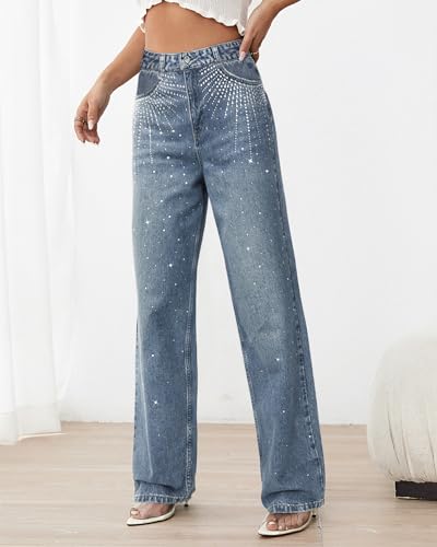 More information about Womens Rhinestone Jeans High Waist Sright Leg Y2K Denim Pants Vintage Wash Trousers Streetwear