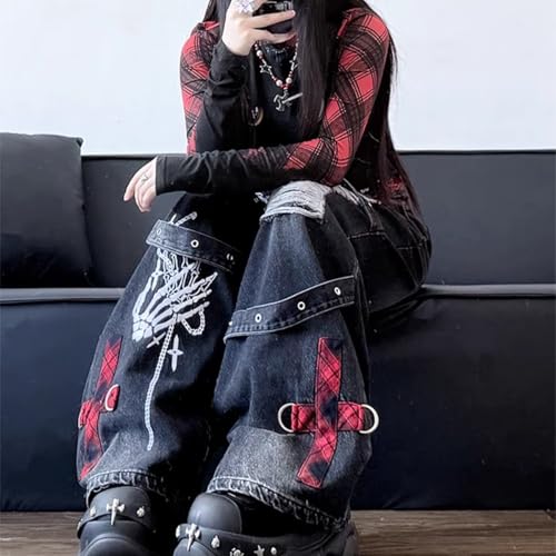 HOT ! Harajuku Gothic High Waisted Straight Leg Jeans Y2K Vintage Lattice Fringe Ripped Embroidered Denim Pants