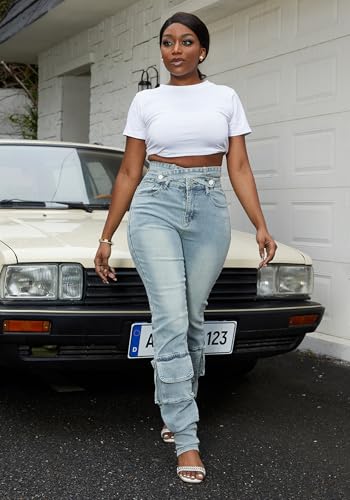 HOT ! Tbahhir Denim Cargo Jeans for Women Skinny High Waisted Jean Criss Cross Stretchy Trousers Y2K Streetwear