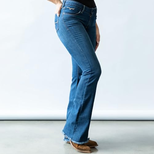 HOT ! Kimes Ranch Women's Lola Raw Hem Western Mid-Rise Flare Leg Extra-Durable Shape-Saving Tri-Blend Denim Blue Jean Trousers