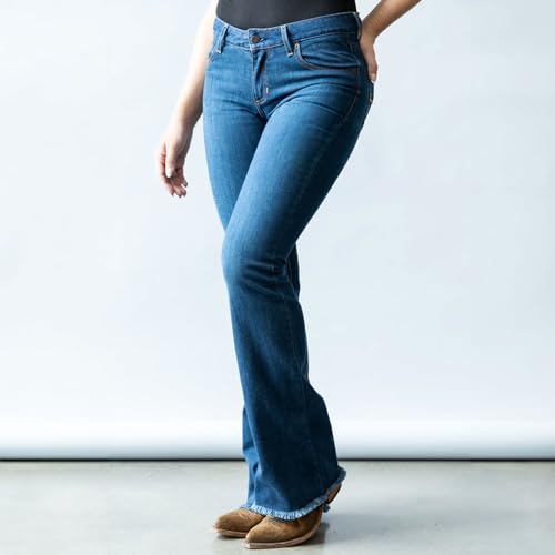 Kimes Ranch Women's Lola Raw Hem Western Mid-Rise Flare Leg Extra-Durable Shape-Saving Tri-Blend Denim Blue Jean Trousers 6