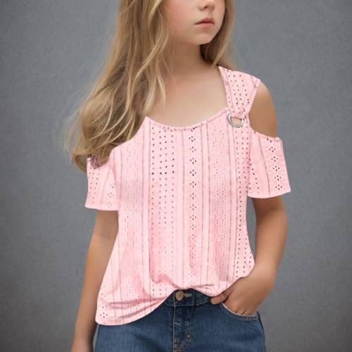 HOT ! 2025 Girls Shirts Soft Crewneck Off The Shoulder Eyelet Blouses Short Sleeve Basic Comfy Trendy Solid Color Tunics