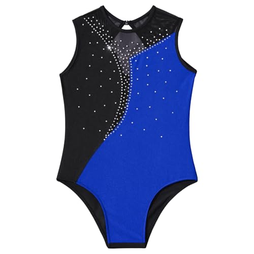 • Sleeveless, round neckline leotard is decorated with shiny rhinestones, contrast color style