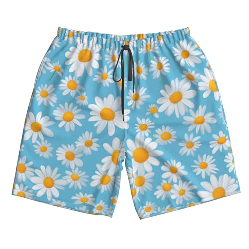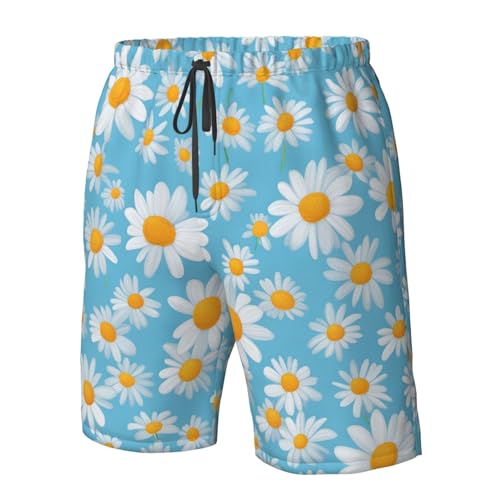 HOT ! White Daisy in Light Blue Background Print Men's Swim Trunks with Liner,Beach Shorts for Summer,Suitable for Water Activities
