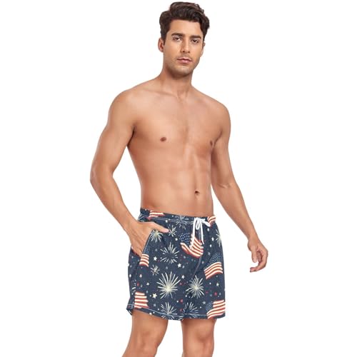 Men's Swim Trunks America Flag Firework Pattern Quick Dry Navy Swimwear Beach Shorts with Pockets 4