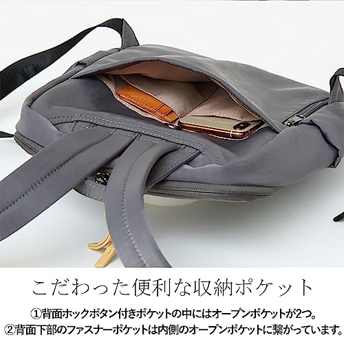 • The gusset is large and has more storage capacity than it looks. There are plenty of storage pockets, and there are open pockets on both sides of the outside that are convenient for storing things like plastic bottles and parasols. In addition, the convenient storage on the back serves as a security measure, making it useful even when the train is crowded.