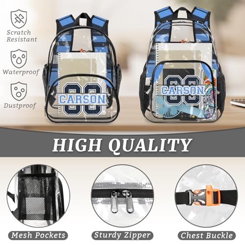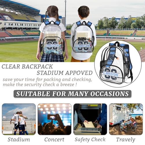 HOT ! Personalized Clear Backpack with Name, Custom Heavy Duty PVC Transparent Backpack,Sports Number See Through Back Pack with Reinforced Strap for Stadium Approved Events Blue