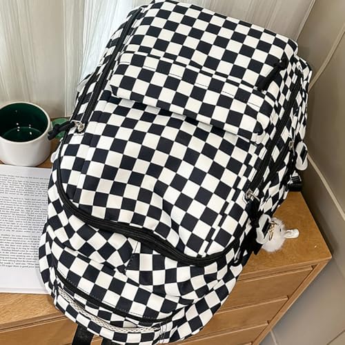 HOT ! Checkered Backpack with Kawaii Pendant for Women, Checkerboard Aesthetic Bookbag for Teens, Nylon Rucksack, Daypack Bag